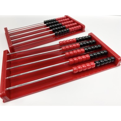 Our new design features a solid hardwood base. You will receive a set of two scorers, one red and one black, each with five rows of red and black beads that slide comfortably on solid steel rods. Durable and long lasting.